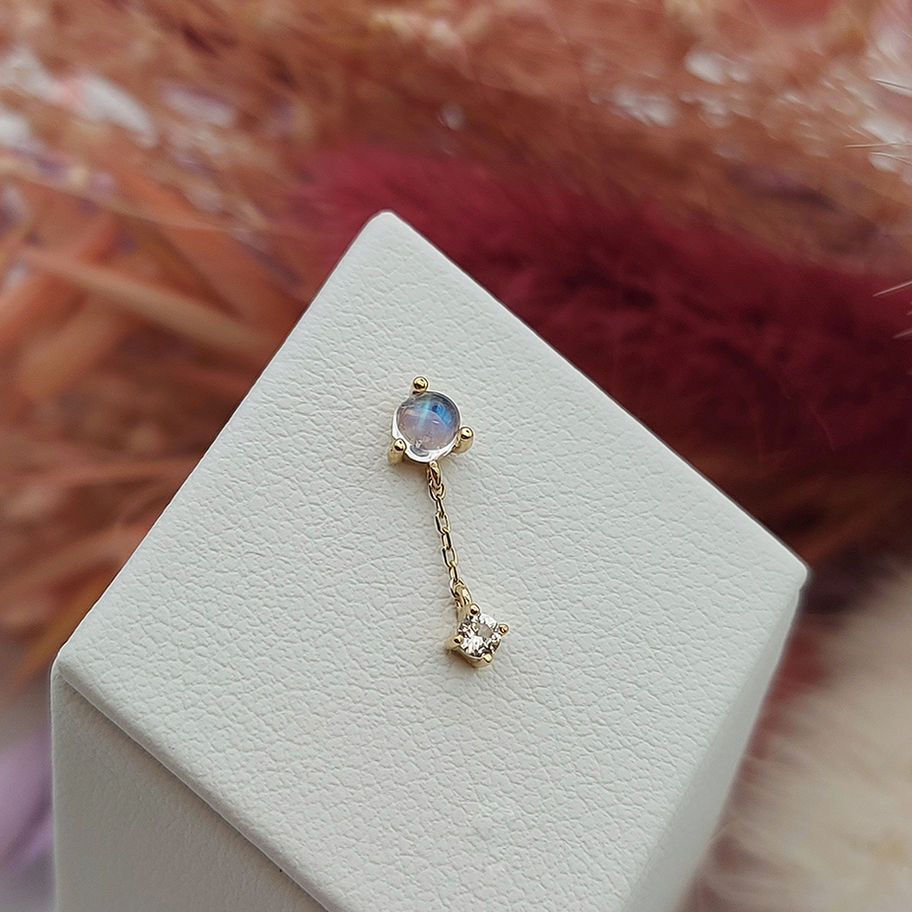 Pierres : (1) 3 x 2.5mm cabochon pierre de lune bleue et (1) 2mm Saphir blanc